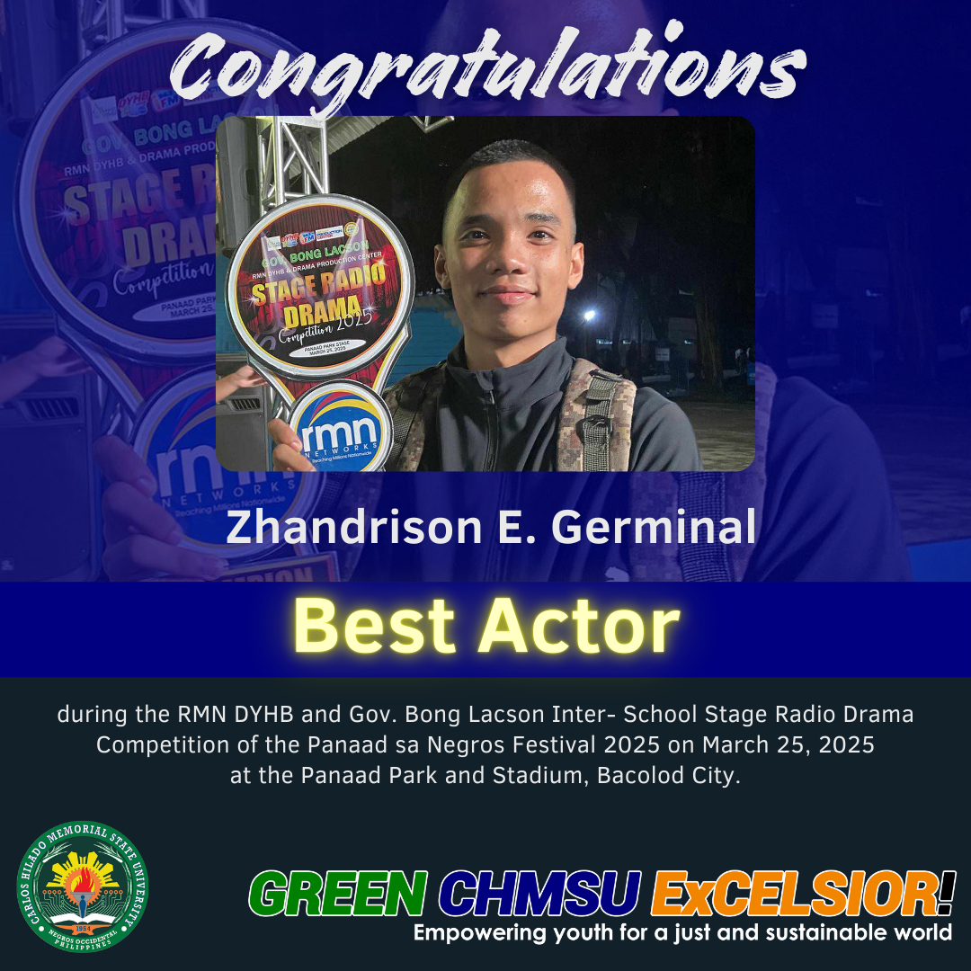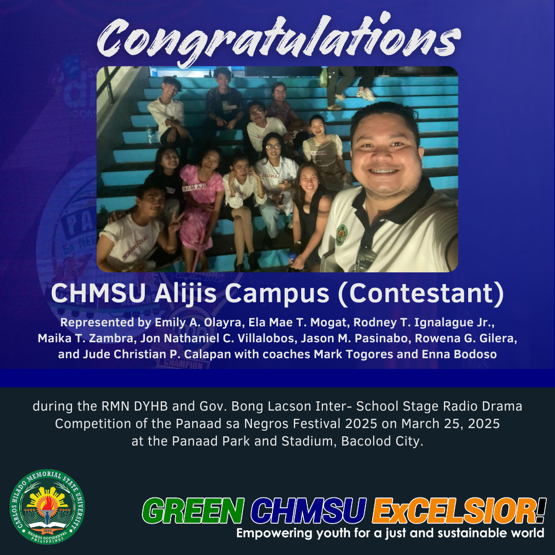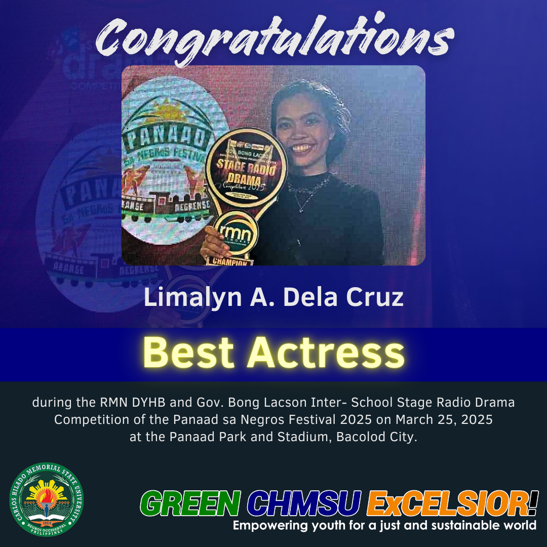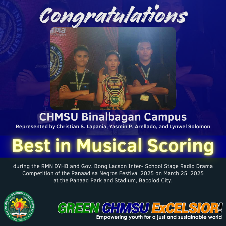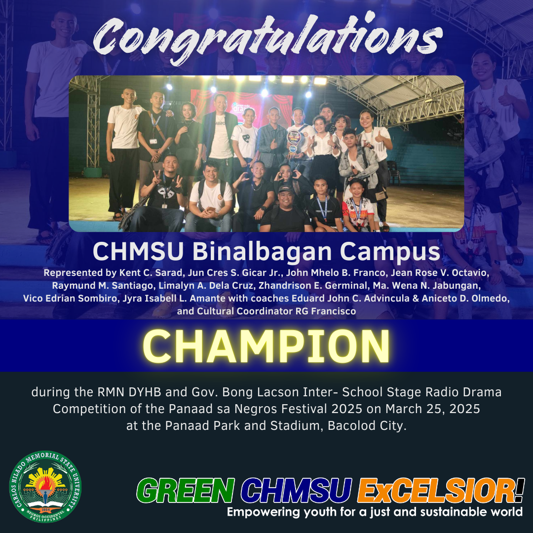 The team from CHMSU Binalbagan rose as the champion and reaped several awards in the first RMN DYHB and Gov. Bong Lacson Inter-School Stage Radio Drama Competition held at the Panaad Park and Stadium on March 25, 2025 in celebration of the 2025 Panaad sa Negros Festival.